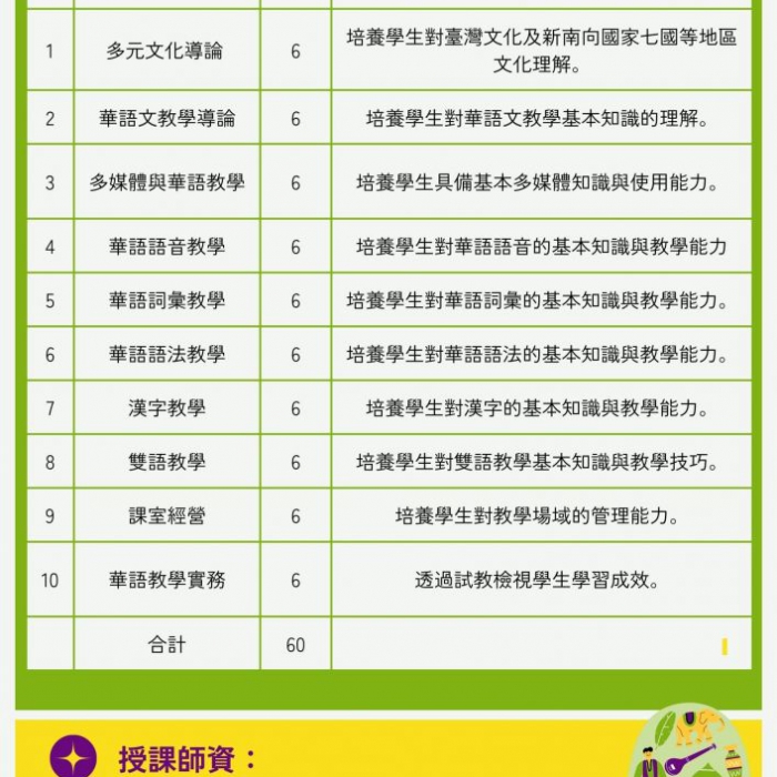 授課師資陣容堅強,結合華語文教學實務與相關研究領域且具有海內外實務教學經驗的第一線教師群。